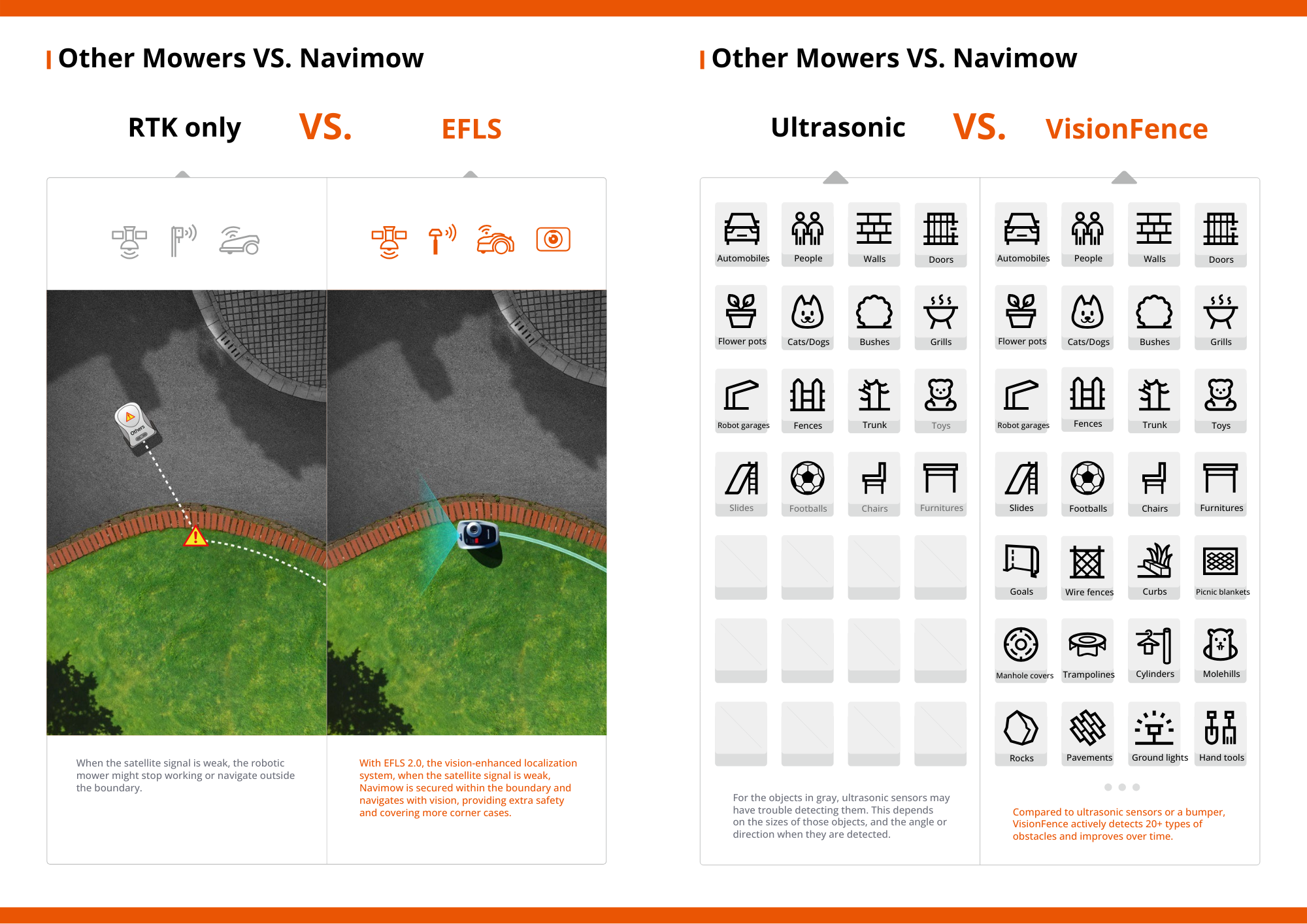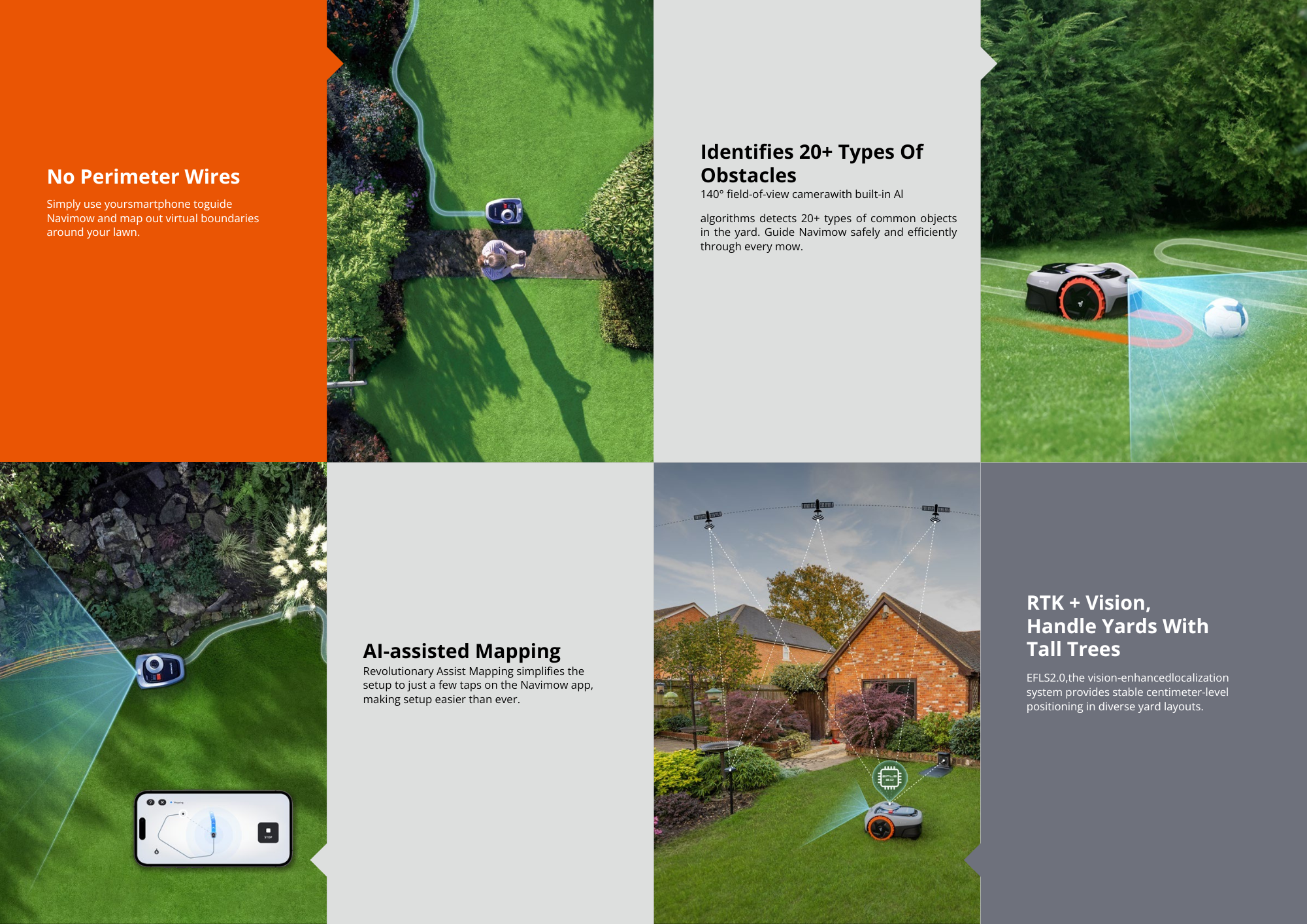 • VisionFence AI with 150+ Obstacle Recognition Powered by VisionFence technology, Navimow i105 identifies and avoids 150+ types of common obstacles, including garden furniture, pathways, toys, and lawn edges. Unlike ultrasonic sensors, the AI vision system improves recognition over time, delivering safer and more precise navigation even in tight or complex spaces.