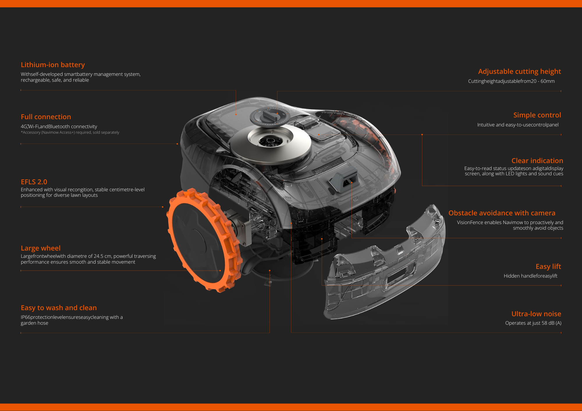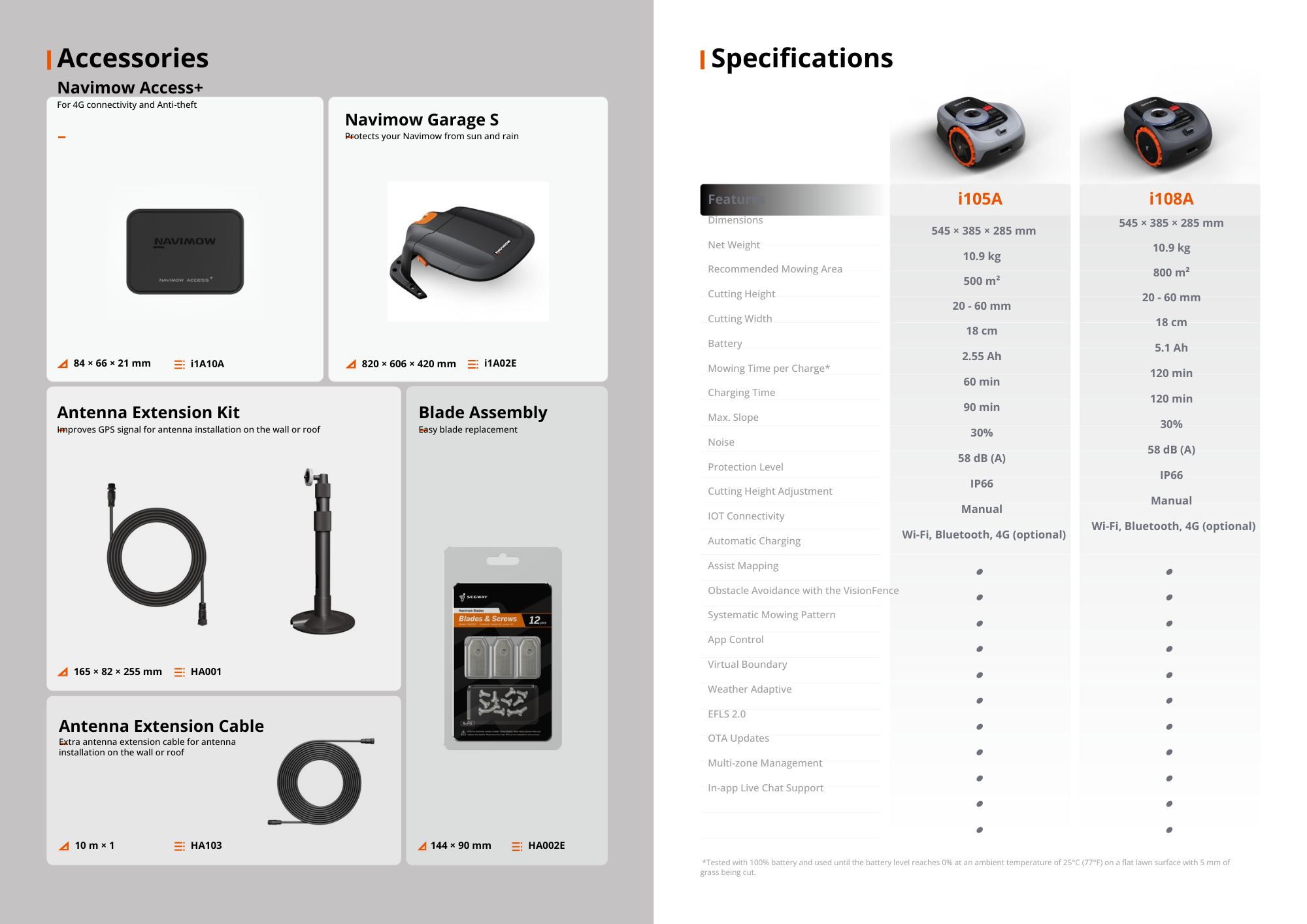 • Lightweight, Weather-Resistant & Secure Design Weighing approximately 10.9 kg, Navimow i105 is easy to handle and maintain. With an IPX6 waterproof rating, it is built for outdoor durability. Integrated security and app-based notifications help protect the mower and provide peace of mind during daily operation.