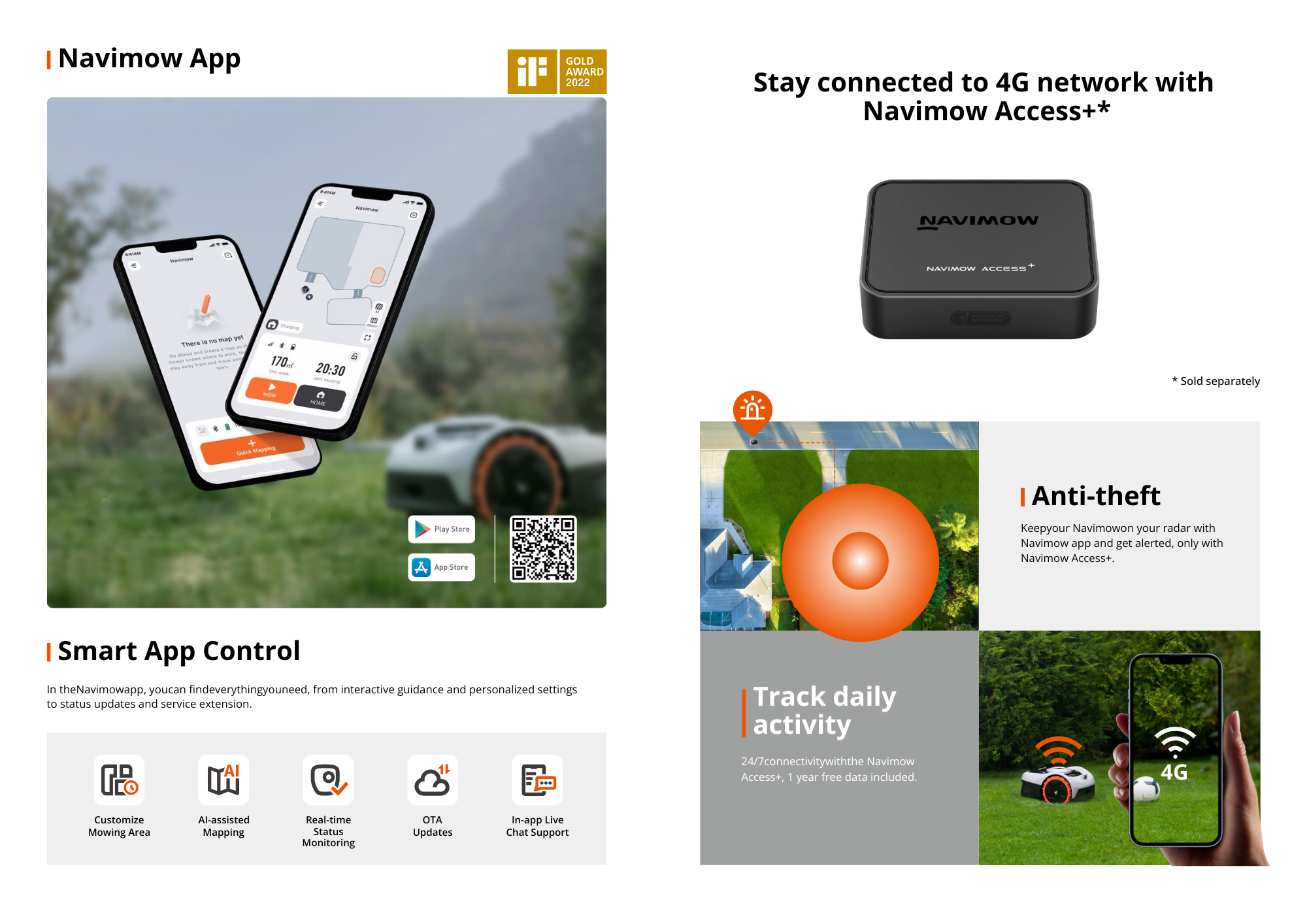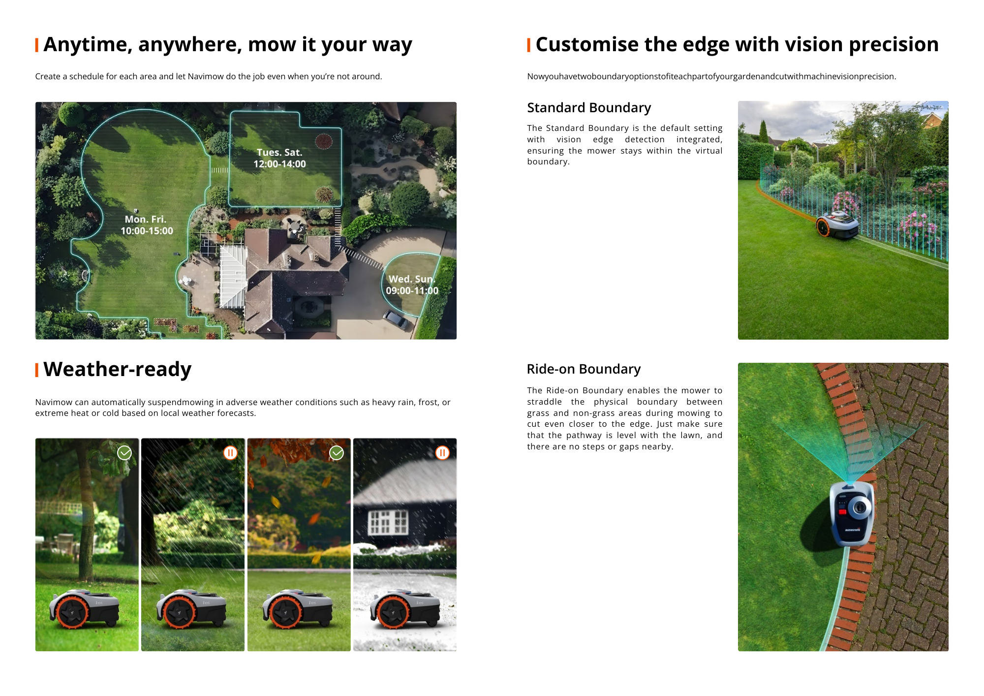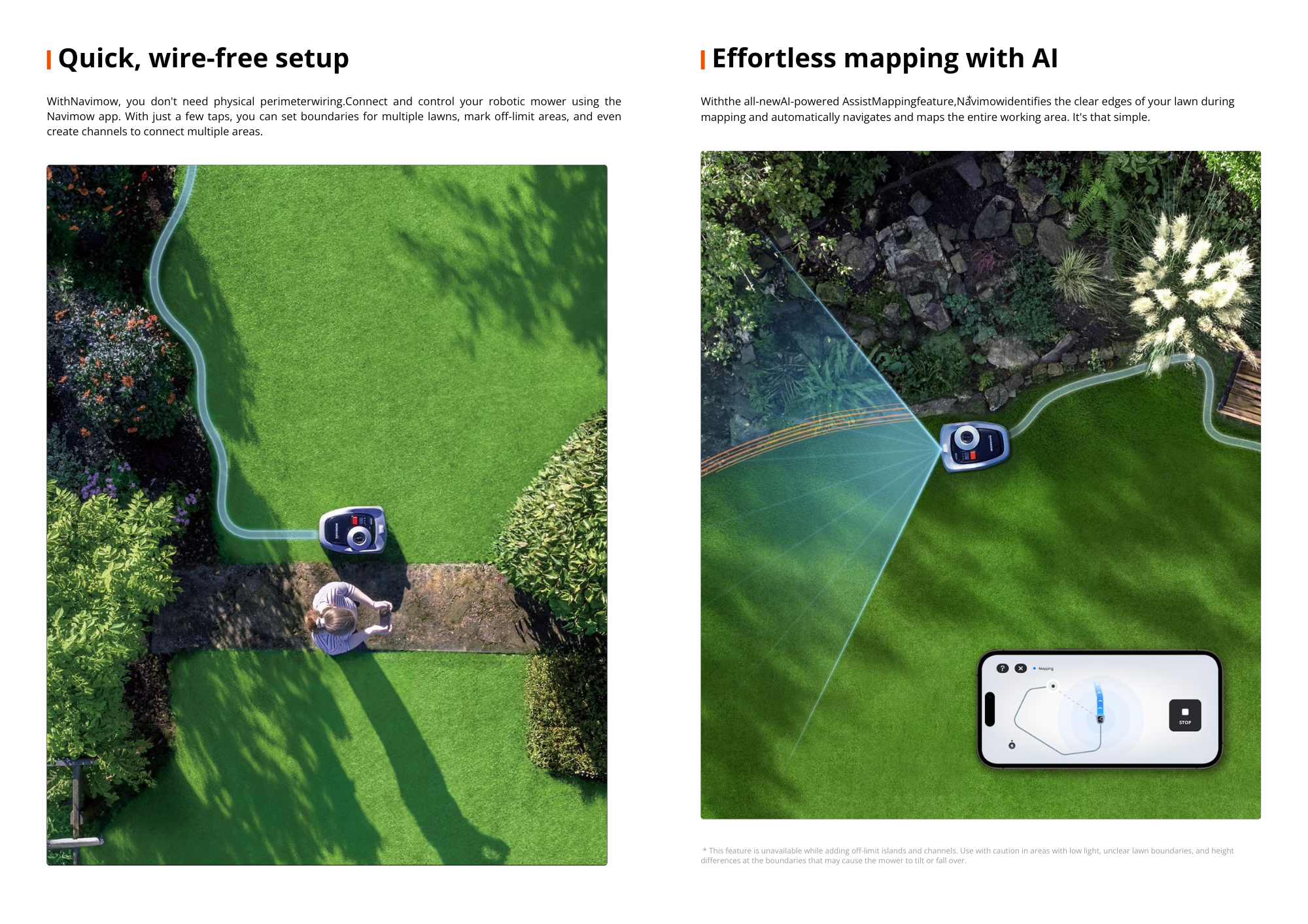 • Multi-Zone Lawn Management & Smart App Control Manage multiple mowing zones directly in the Navimow app. Create no-go areas, customize mowing schedules, and monitor progress anytime. The mower automatically returns to its charging station when needed and resumes mowing once recharged, enabling fully autonomous operation.