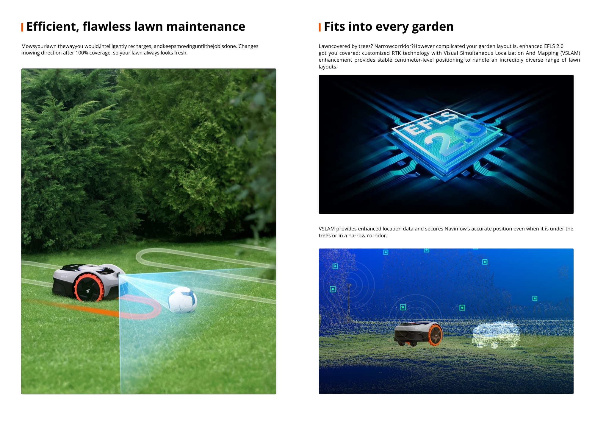 • Wire-Free Robotic Mower Navimow i105 has recommended coverage area up to 500 m², making it ideal for small to medium yards. Using VisionFence technology that combines RTK positioning with AI vision, the mower automatically maps your lawn through the app without perimeter wires, reducing setup time and eliminating manual boundary installation.